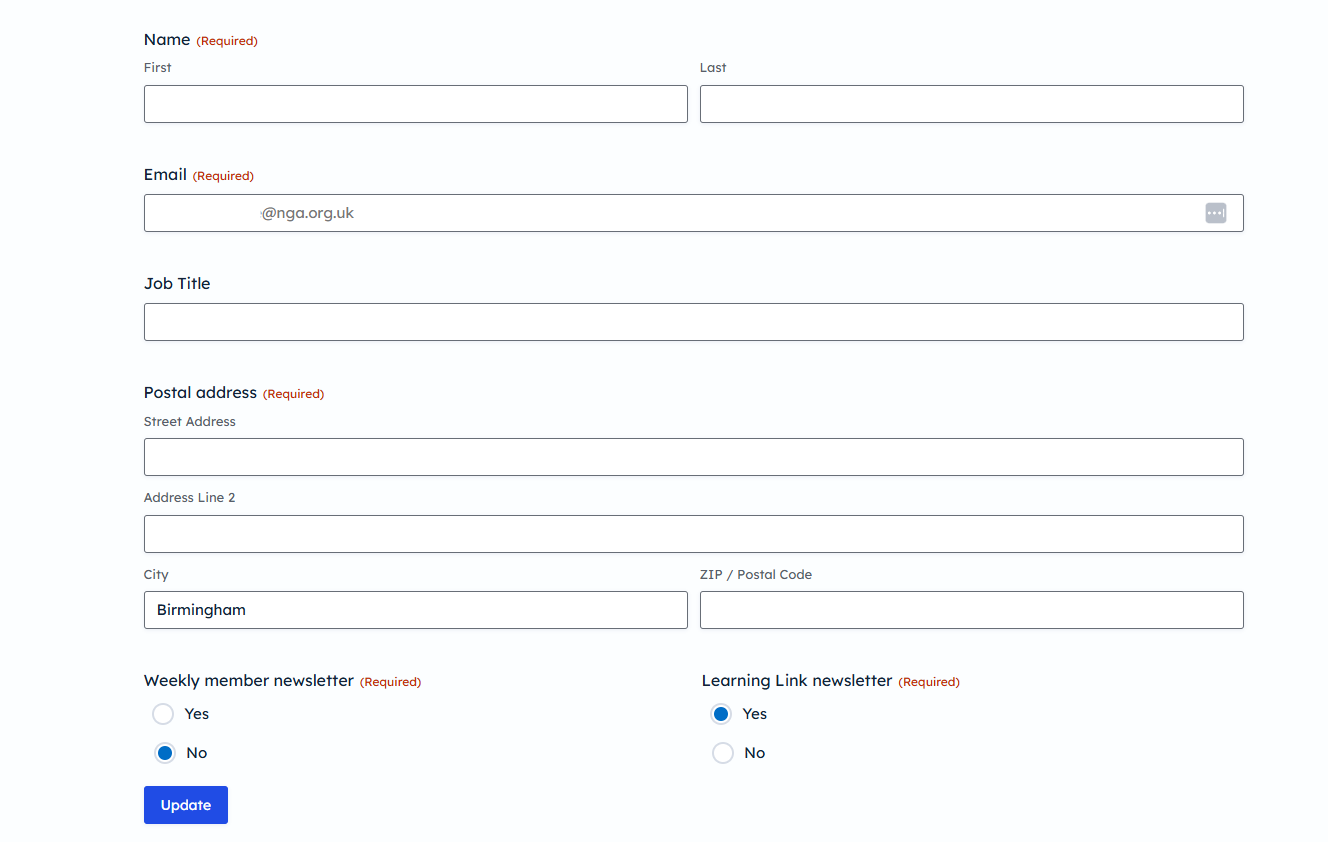 You can edit your name, address, job title, and newsletter communication preferences.