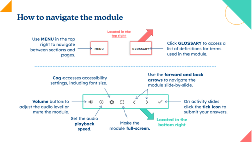 If you need help using the module player, click HELP in the top right to view a quick guide (pictured below), including how to switch to full screen for a better experience on smaller devices.
