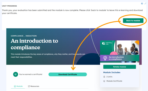 Click Back to module to return to the module landing page, where you can download your certificate.