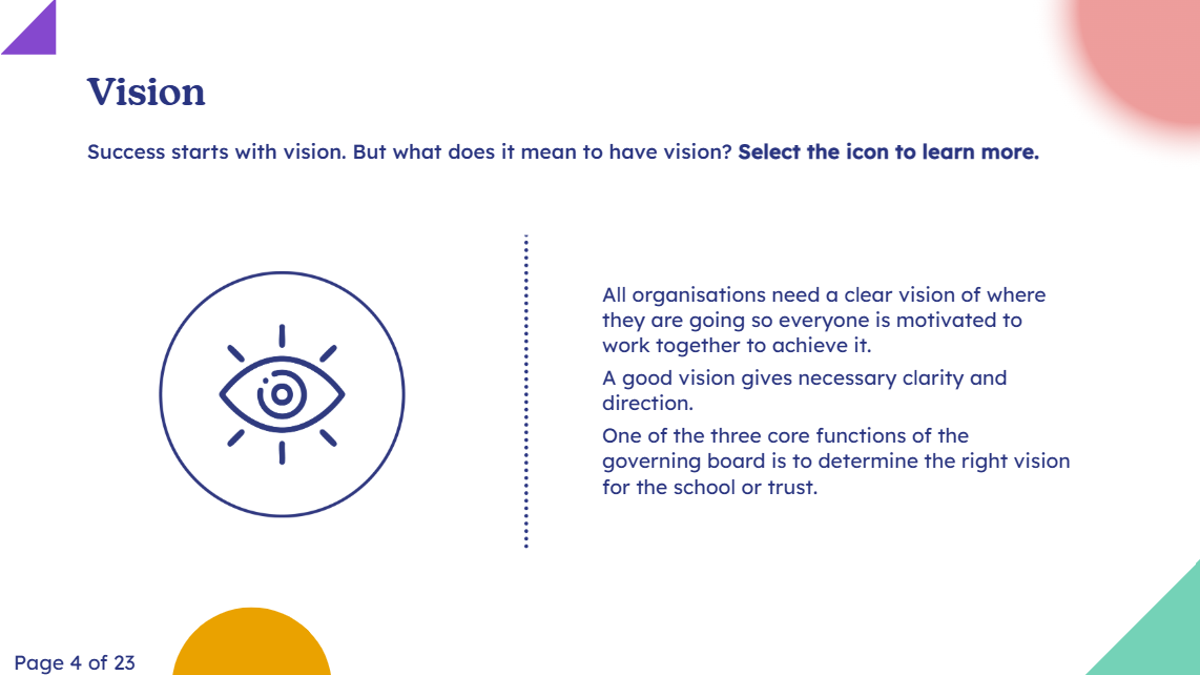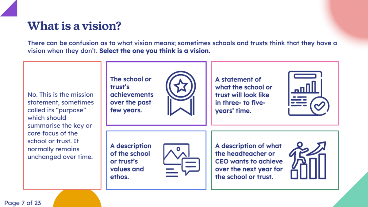 This module provides you with a good understanding what a school or trust vision should look like, as well as how to create or refresh the vision for your school or trust.