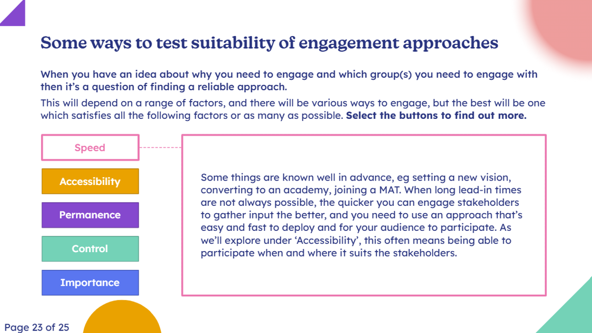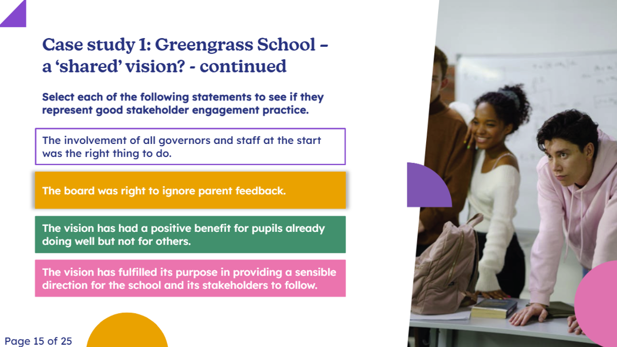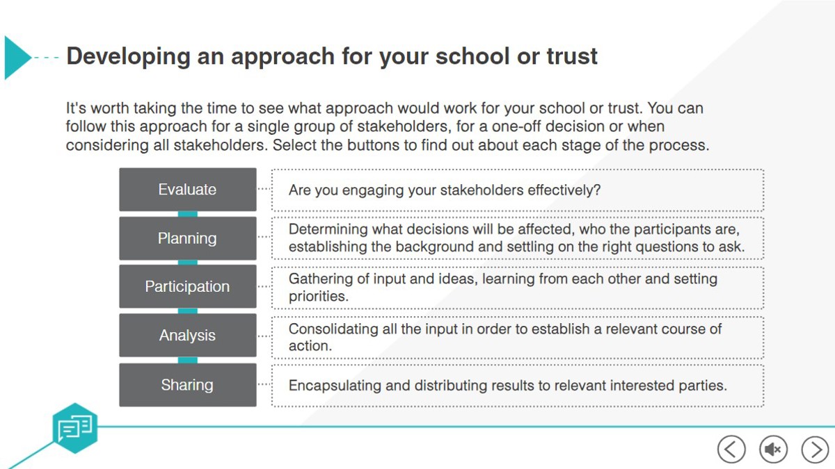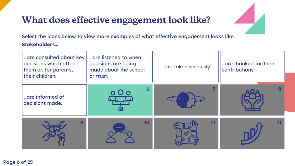 This bitesized module is not intended to provide a magic wand solution or a complete list of the many ways in which a school or trust can engage with its stakeholders. Instead it focuses on exploring how stakeholders can be involved meaningfully in the decision-making about what happens in their school or trust.