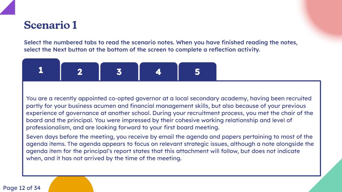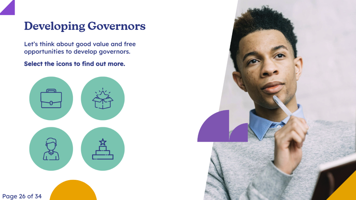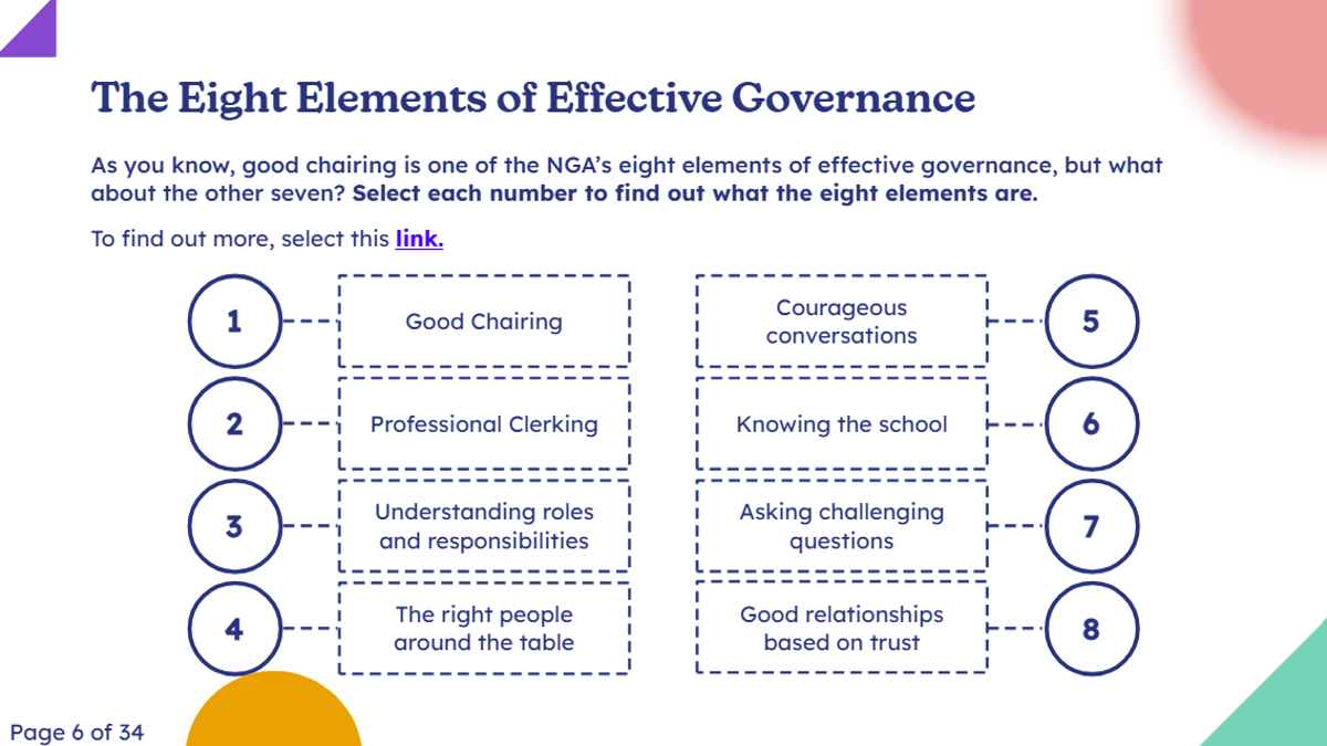 This module provides governors, trustees and clerks with guidance and practical steps for preparing and reviewing a succession plan for chairing roles on their board and encouraging their ongoing learning and development.