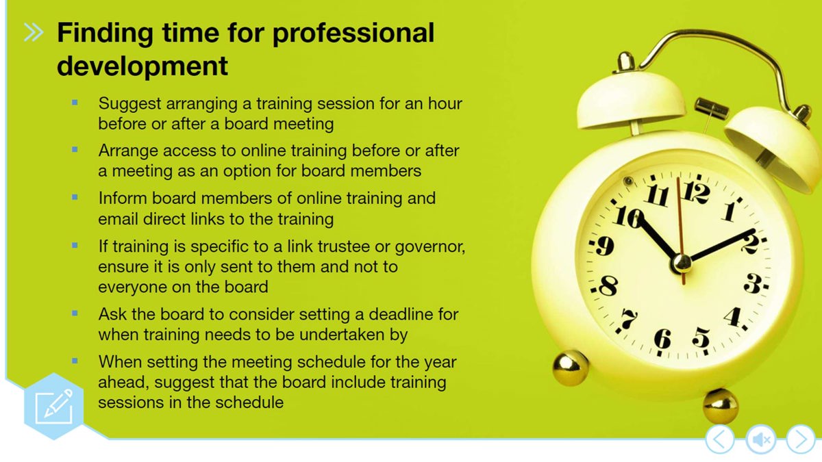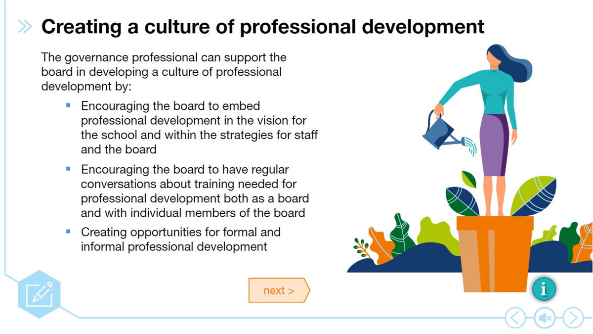 This module will provide you with the tools and knowledge required to create a culture of professional development and give you a clear picture of some of the options available to you, which can be tailored to meet the development needs of your board(s).
